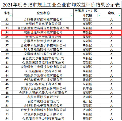 世綠環保在合肥市畝均效益中被評為A類企業
