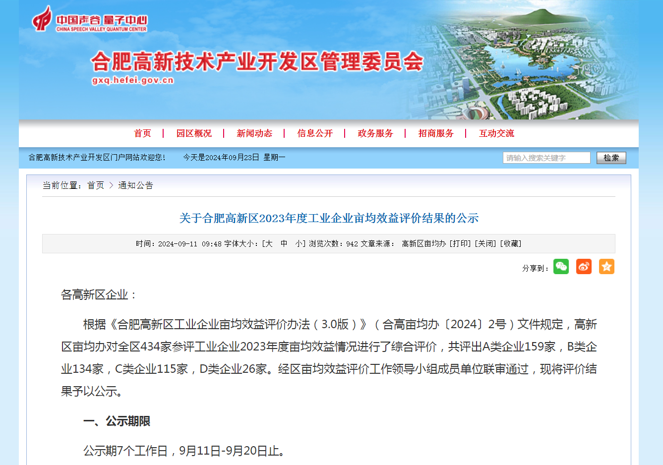 根據《合肥高新區工業企業畝均效益評價辦法(3.0版)》(合高畝均辦〔2024〕2號)文件規定,高新區畝均辦對全區434家參評工業企業2023年度畝均效益情況進行了綜合評價,共評出A類企業159家,B類企業134家,C類企業115家,D類企業26家。經區畝均效益評價工作領導小組成員單位聯審通過,近期對評價結果予以了公示。