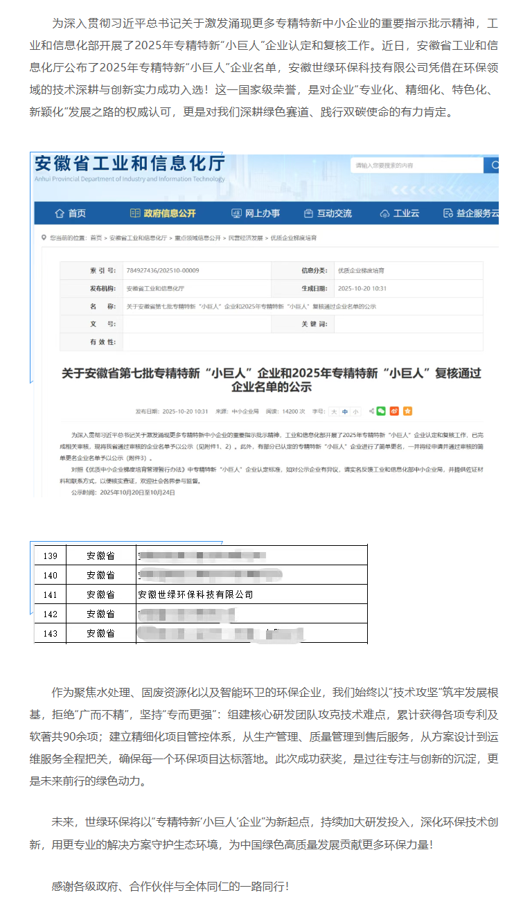 喜訊 | 世綠環(huán)保榮膺2025年國(guó)家級(jí)專(zhuān)精特新“小巨人”企業(yè)!
